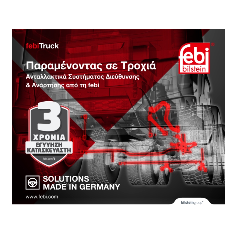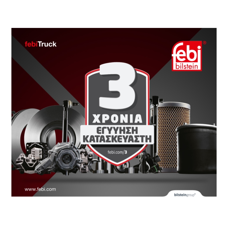 Η εταιρεία FEBI Bilstein είναι μια απο τις πρωτοπόρες εταιρείες στον κόσμο, στον κλάδο των ανταλλακτικών αυτοκινήτων και βαρέων οχημάτων του ανεξάρτητου εμπορίου. Απο το σύστημα διευθυνσης, τα μέρη μηχανής, το σύστημα φρένου, το αμάξωμα μέχρι τα ηλετρονικά, τα συστήματα αέρος και το πρόγραμμα febi plus, η Febi bilstein παρέχει ο,τι χρειάζεται η επαγγελματική επισκευή του επιβατηγού, του επαγγελματικού οχήματος ή του λεωφορείου.